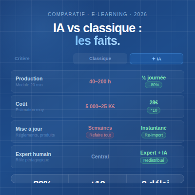 L'approche IA est fondamentalement différente. Elle comprend le contenu de vos slides et crée une expérience pédagogique adaptée. Le résultat n'est pas une copie de votre PowerPoint — c'est une formation à part entière.